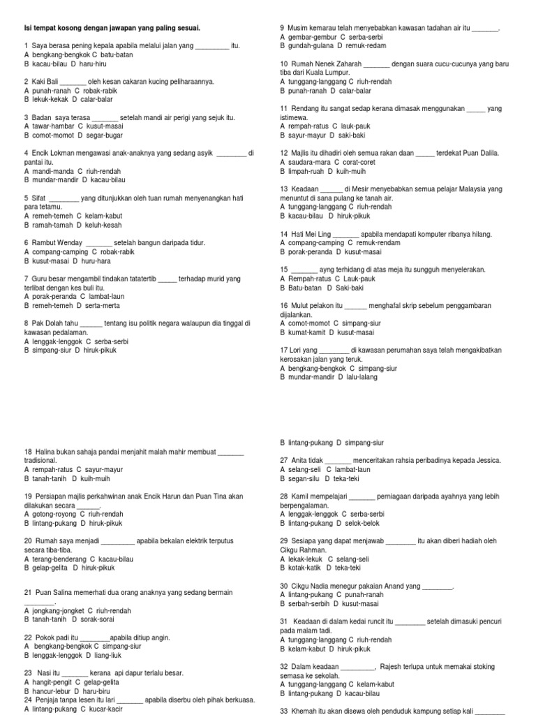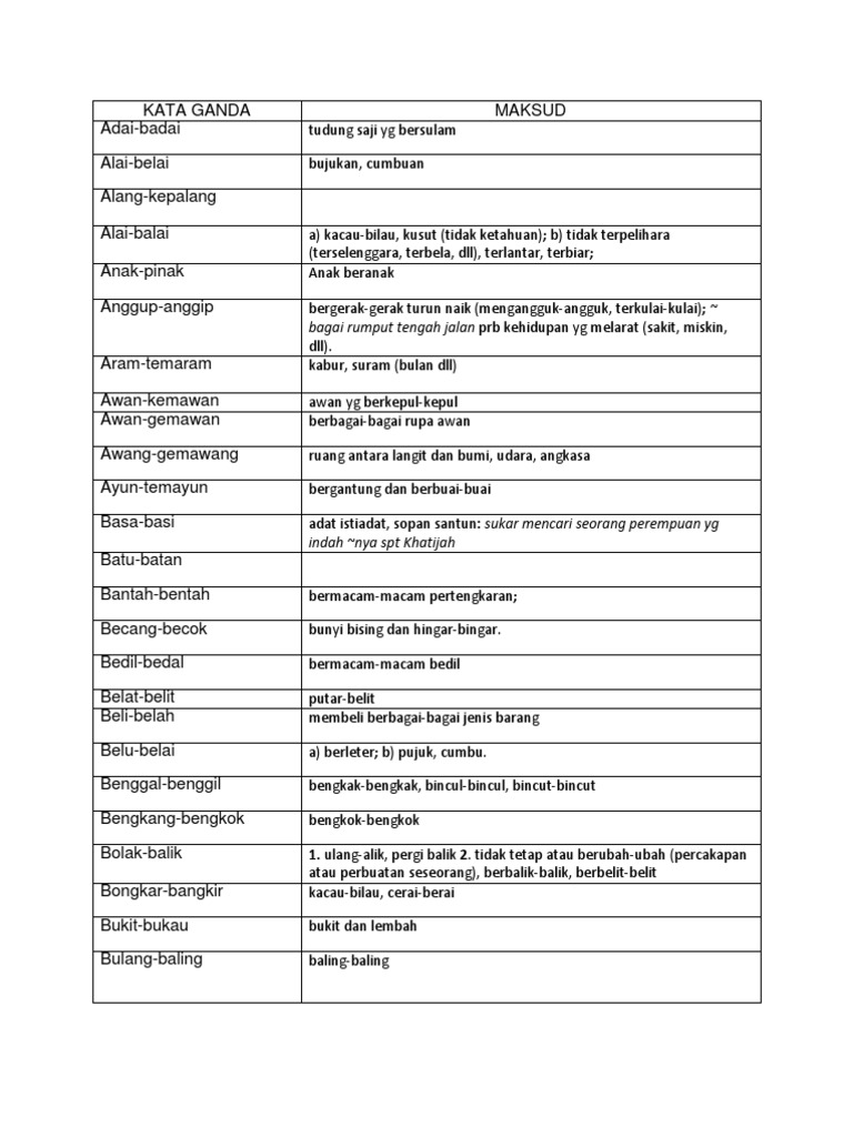 Download & view latihan kata ganda berentak.docx as pdf for free. Bebalai,bebarau,bebawang,bebenang, bebola,bebotok,bebuli,bebuluh, cecair,cecawi,cecekak,dedali,dedalu, dedamak,dedaru,dedawai aslam, apakah kata ganda berentak / berima perkataan : You've reached the end of your free preview. Latihan kata ganda separa отваряне на кутията. Lengkapkan lembaran kerja dengan mengisikan tempat kosong dengan kata ganda berentak yang bersesuaian.