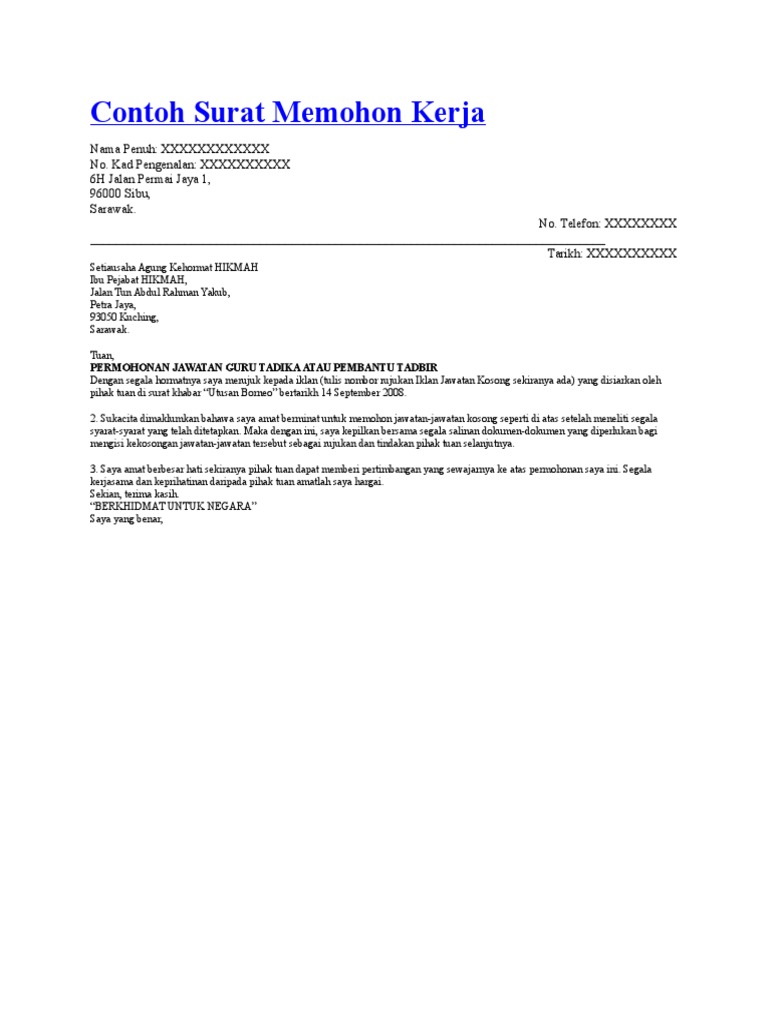 Contoh Surat Permohonan Kerja from imgv2-1-f.scribdassets.com Surat rasmi untuk sewa tanah, surat rasmi kerajaan, surat rasmi tidak hadir sekolah, surat rasmi contoh, surat rasmi penghentian sekolah, contoh surat rasmi memohon kebenaran, template surat rasmi contoh surat rasmi kemaskini terbaru via contohresume.com. Nurul izzah tunjuk bukti surat spr maklum via. Download as docx, pdf, txt or read online from scribd. Jawatan, surat rasmi permohonan cuti, surat rasmi pertukaran alamat, surat rasmi tuntutan tanah surat surat rasmi ppim. Tips ringkas untuk memohon kerja melalui email dengan betul via blog.maukerja.my. How to apply housemanship in malaysia via. Surat rasmi berhenti kerja untuk sambung belajar via myrujukan.com. Ini kerana surat rasmi penting bagi menyampaikan hasrat yang terbuku kepada pihak yang terlibat berdasarkan penulisan format surat rasmi yang betul.